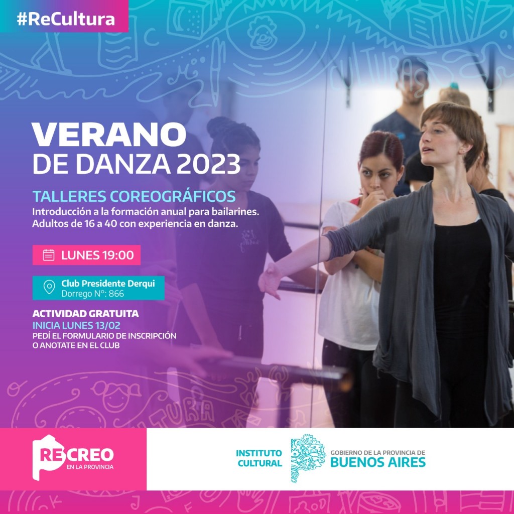 (Pilar, 01.Feb.2023 / A1 Noticias) El Instituto Cultural de la Provincia de Buenos Aires anuncia el comienzo de “Verano de Danza 2023”, ciclo de talleres de formación para bailarines y bailarinas que tendrá lugar en Pilar. Dirigido a todas las edades y de manera gratuita, el ciclo se llevará a cabo durante cuatro semanas en el Club Presidente Derqui (Dorrego 866) y oficiará de preludio al taller anual que comenzará en abril.