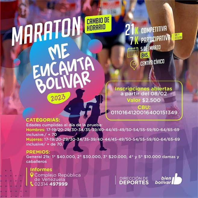 (Bolívar, 01.Mar.2023 / A1 Noticias) La competencia organizada por la Dirección de Deportes de la Municipalidad, a cargo de Alejandro Viola, tiene un valor de $ 2.500 para los 21 km, incluye remera y medalla finisher, y los 7 km cuentan con inscripción gratuita.