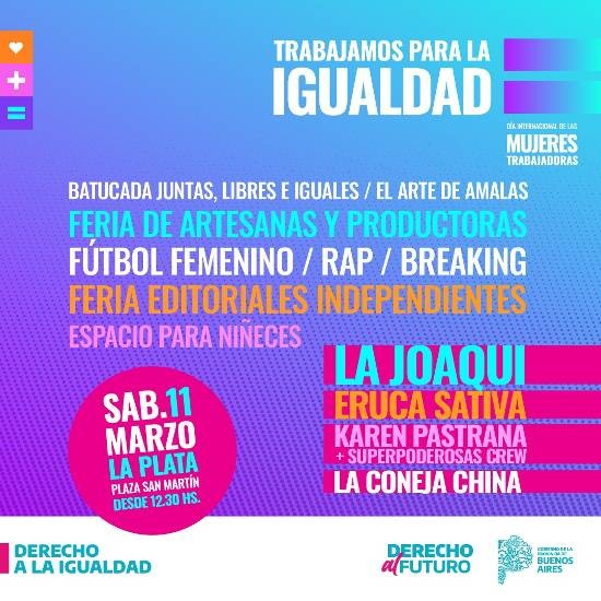 (La Plata, 06.Mar.2023 / A1 Noticias) En el marco de una nueva conmemoración del Día Internacional de las Mujeres Trabajadoras, el Ministerio de las Mujeres, Políticas de Género y Diversidad Sexual de la provincia de Buenos Aires convoca a una jornada de actividades que se realizará el sábado 11 de marzo, a partir de las 12:30, en Plaza San Martín, 6 y 50, de la ciudad de La Plata.