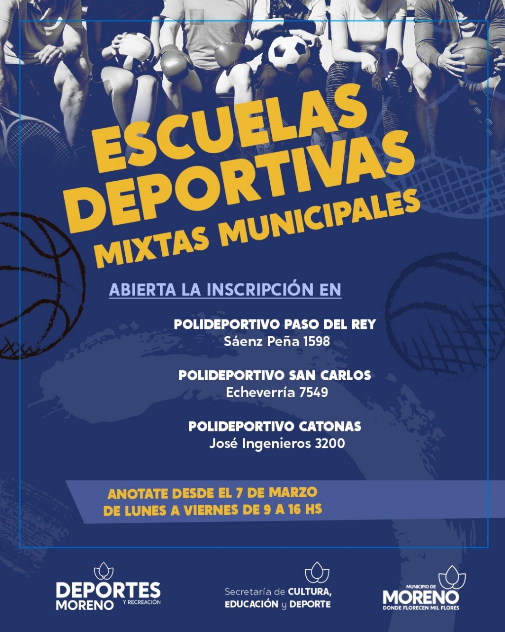 (Moreno, 06.Mar.2023 / A1 Noticias) El Municipio de Moreno, a través de la Secretaría de Cultura, Educación y Deportes, invita a toda la comunidad a participar de las Escuelas Deportivas Municipales que se desarrollarán en los polideportivos Paso del Rey, Catonas y San Carlos.