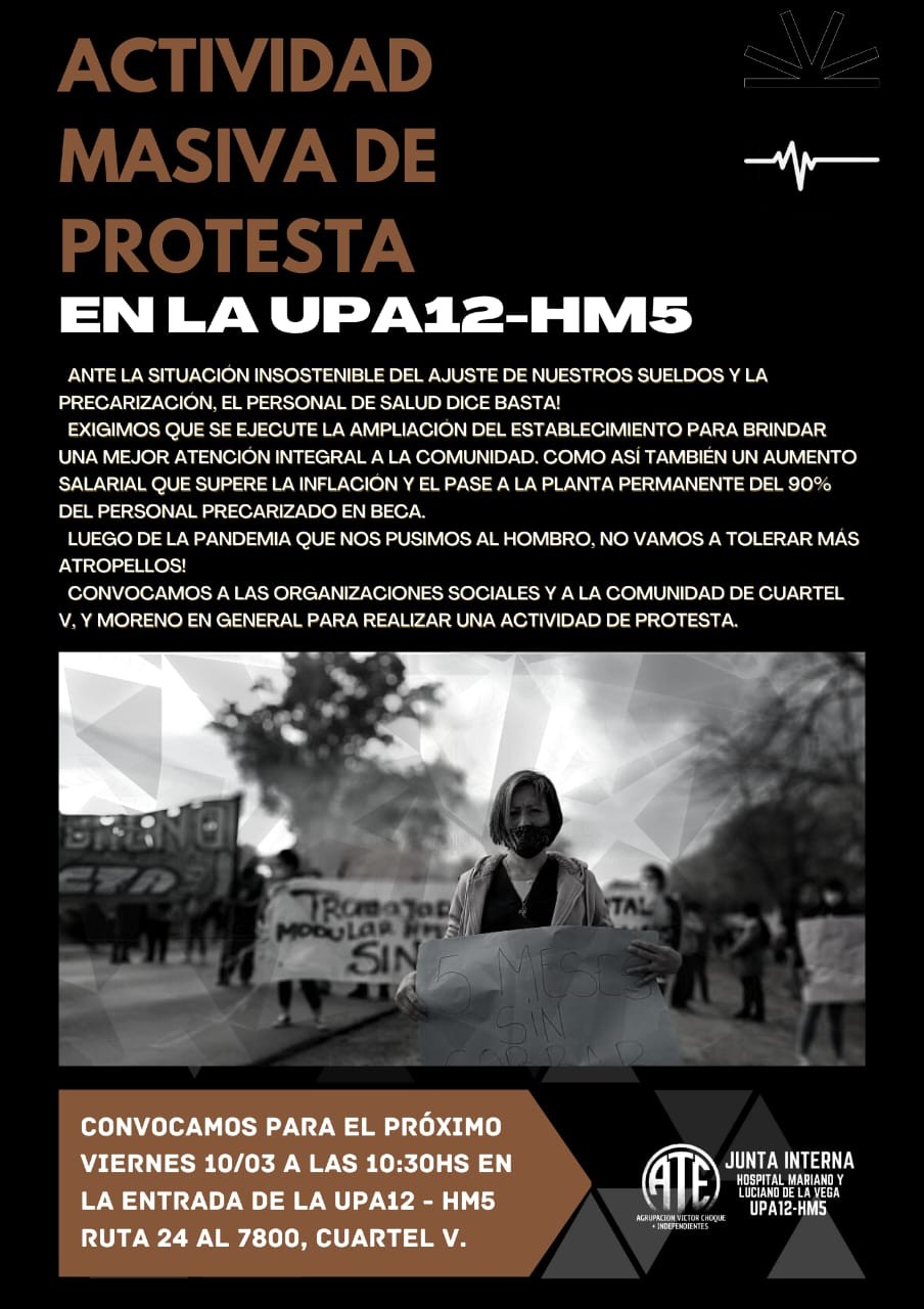 Luego de una asamblea y por votación casi unánime a mano alzada de ATE, el personal de salud del UPA12-HM5 se manifestará el próximo viernes 10 de marzo a las 10:30 hs, en la Ruta 24 al 7800 en Cuartel V