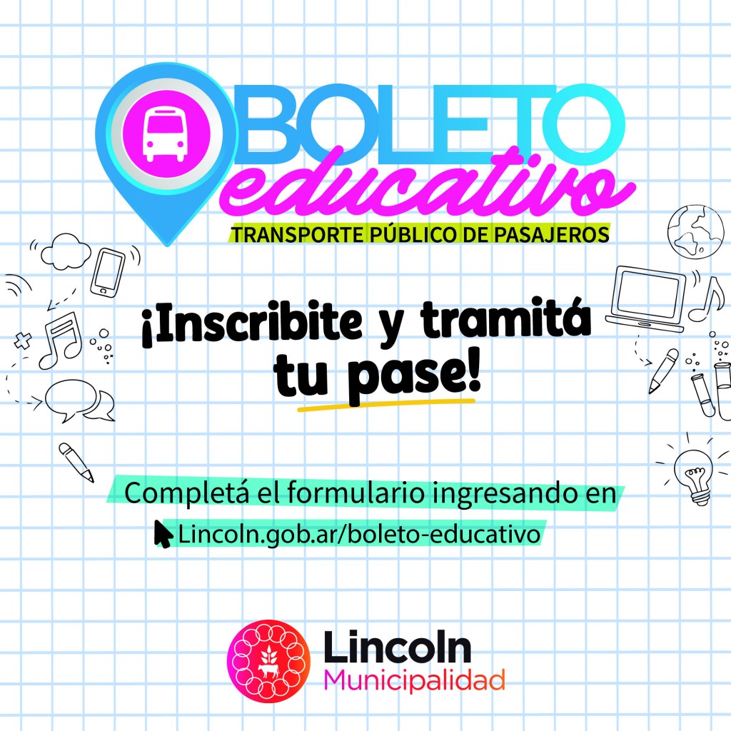 Se encuentra abierta la inscripción para acceder al “Boleto Educativo”, destinado a estudiantes, docentes y personal auxiliar que permitirá contar con un descuento del 50% en el servicio de transporte interurbano. Este programa, se implementa a través de la Secretaría de Cultura y Educación, y habrá tiempo hasta el 31 de marzo para completar la solicitud de forma online, ingresando en: www.lincoln.gob.ar/boleto-educativo