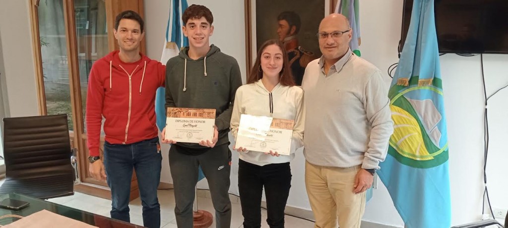 El intendente, Esteban Reino recibió en la “Sala de los Intendentes” a quienes se destacaron en el Campeonato Argentino de Cadetes de Natación. Ellos son los integrantes del equipo del Club Racing, Chiara Colaneri y Eneas Feingol