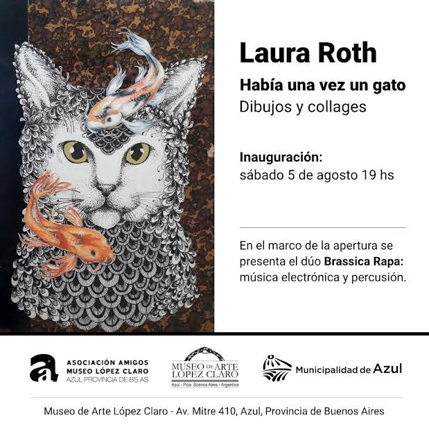 La Municipalidad recuerda que este sábado a las 19 en Museo López Claro, se realizará la inauguración de la muestra de arte “Había una vez un gato” de la artista azuleña Laura Roth