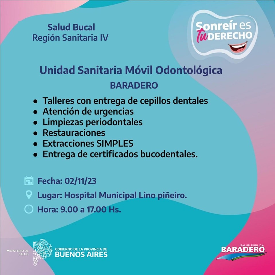 (Baradero, 01.Nov.2023 / A1 Noticias) Se realizarán talleres con entrega de cepillos dentales, atención de urgencias, limpiezas periodontales, restauraciones, extracciones simples y entrega de certificados bucodentales.