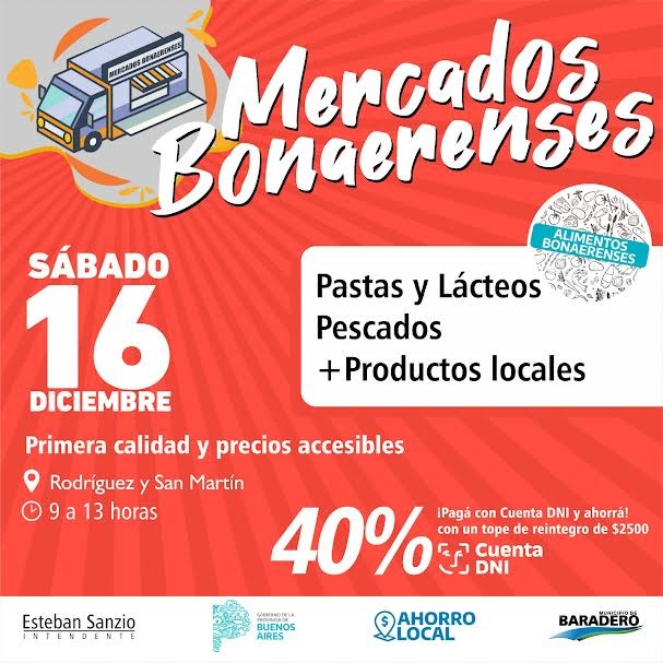 El sábado 16 de diciembre de 9 a 13 horas en San Martín y Rodríguez, el municipio llevará adelante una nueva edición de Mercados Bonaerenses que contará con productos de calidad y a precios accesibles con el Camión de Pastas y Lácteos, el Camión de Pescados y la importante participación de productores locales