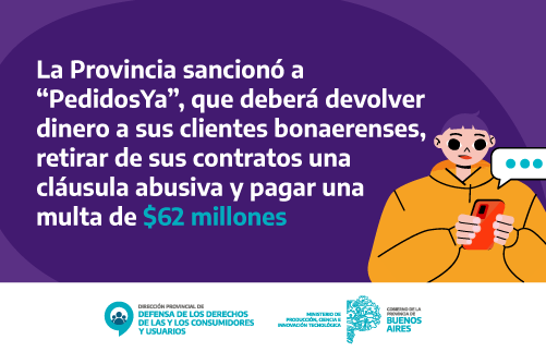 (Buenos Aires, 20.Dic.2023 / A1 Noticias) El Ministerio de Producción, Ciencia e Innovación Tecnológica de la provincia de Buenos Aires, con el fin de garantizar el cumplimiento de los derechos de las y los consumidores, dispuso una multa de $62.400.000 a la empresa PedidosYa y le ordenó la devolución del dinero cobrado a usuarios y usuarias bonaerenses en concepto de “tarifa de servicio”. La empresa, además, deberá suprimir ese costo adicional en sus contratos.