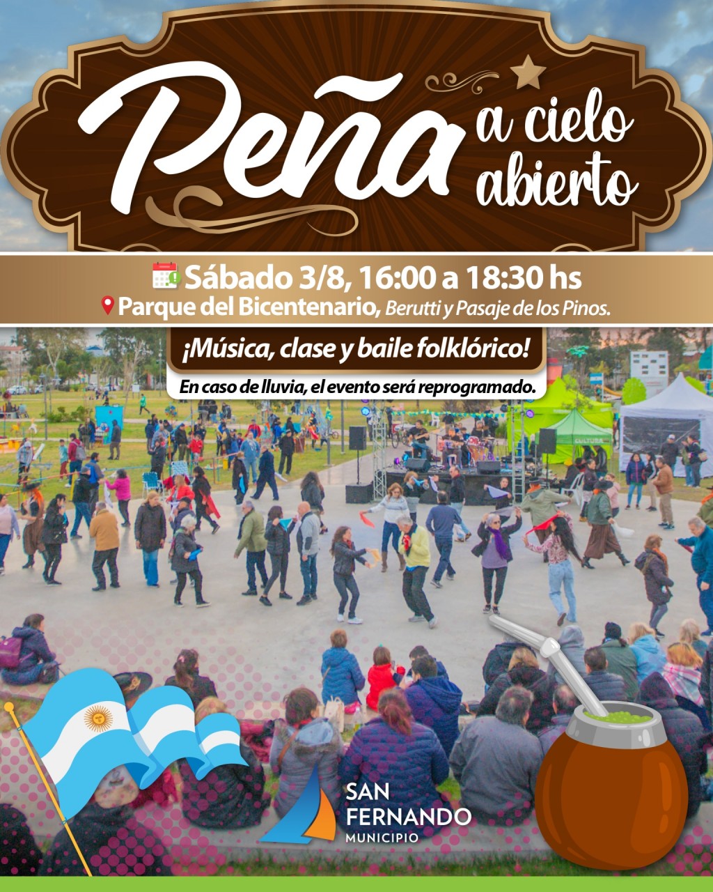 El sábado 3 de agosto de 16 a 18:30h en el Parque del Bicentenario (Berutti y Los Pinos) se llevará a cabo la Peña Folklórica que contará con ‘Ensamble Criollo’ una clase con Eduardo Roca y Bárbara Contreras; ‘La Popular’ Compañía de Danzas. Además estarán los talleres culturales invitados, los ganadores de Juegos Bonaerenses etapa municipal y un gran cierre con ‘La Revancha’. En caso de lluvia el evento podría reprogramarse.