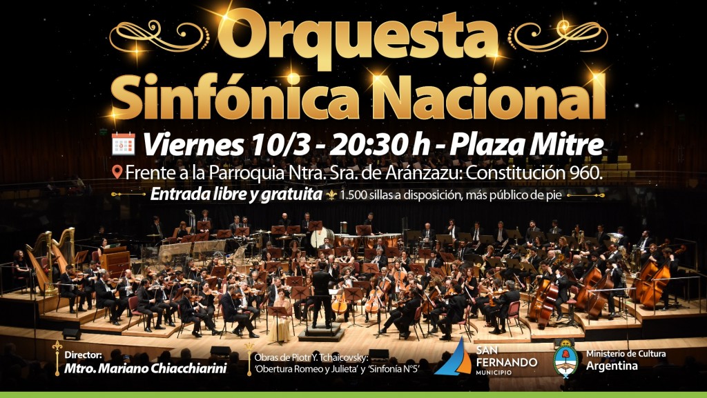 (San Fernando, 06.Mar.2023 / A1 Noticias) El Municipio de San Fernando y el Ministerio de Cultura de la Nación, en adhesión al Mes de la Mujer, invitan a los vecinos a disfrutar del concierto que brindará la Orquesta Sinfónica Nacional con la dirección del Maestro Mariano Chiacchiarini, el viernes 10 de marzo a las 20:30 horas.