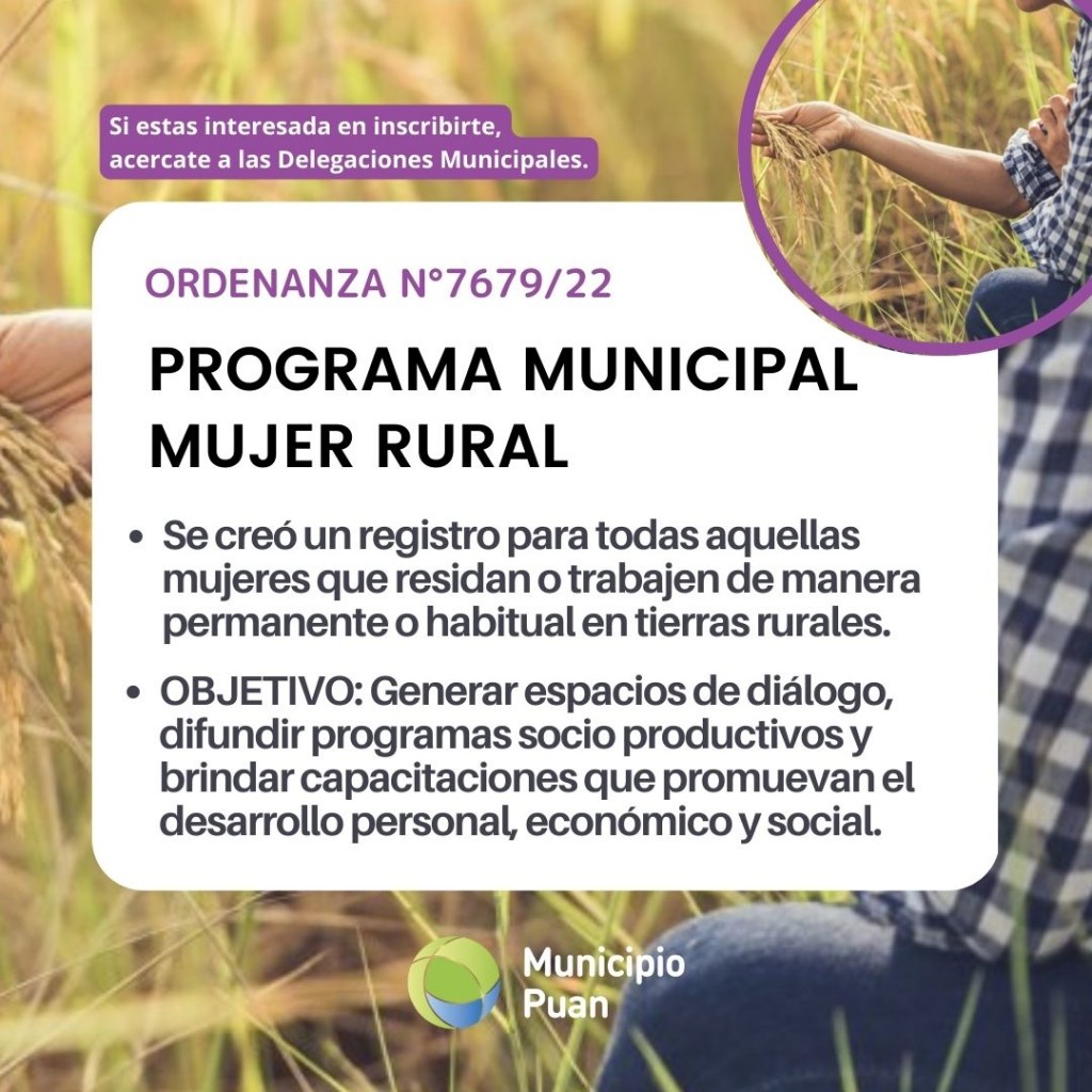 A través de la Ordenanza N° 7679/22 se creó el Programa Municipal Mujer Rural con el objetivo de visibilizar a las mujeres que se encuentran en el ámbito rural, generar espacios de diálogo, difundir programas socio productivos y brindar capacitaciones que promuevan el desarrollo personal, económico y social