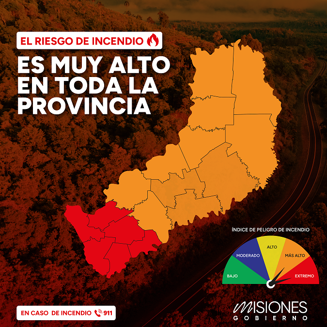 El Gobierno de Misiones recuerda a la población que toda la provincia sigue en emergencia ígnea debido al alto riesgo de incendios, agravado por las altas temperaturas y la falta de lluvias. Según el informe de este miércoles, seis departamentos misioneros se encuentran bajo un índice de peligro de incendio “EXTREMO” , mientras que once presentan un riesgo “MUY ALTO”.