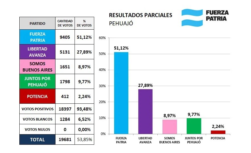 Contundente victoria de Fuerza Patria en el distrito. En segundo lugar se ubica La Libertad Avanza, mientras que el tercer puesto se reparte entre dos espacios de oposición: Juntos por Pehuajó y Somos Buenos Aires